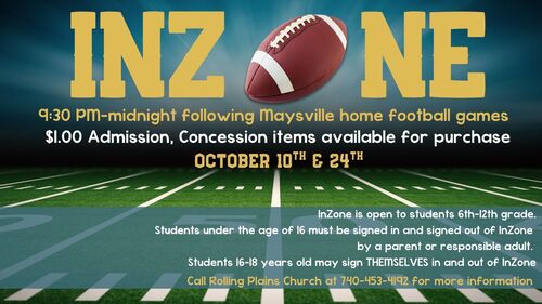 InZone is a fun opportunity to serve in a wonderful ministry to Jr./Sr. High students, from 9:30 PM – midnight, following the Maysville home football games, October 10th & 24th. To volunteer, sign up in the events section in the APP or contact a Family Life Ministry leader or Heather Matarazzo (Heather@rollingplainsgmc.com)