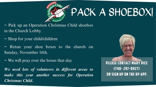 Operation Christmas Child shoeboxes are available in the Lobby. Please take one or more and fill them with all kinds of goodies for children all around the world to be blessed at Christmas time. The Good News of Jesus Christ is accompanied with each box given away. Hold onto your filled boxes until Collection Sunday on November 16th and we will pray over the boxes that day before they are sent out around the world. We need lots of volunteers in different areas to make this year another success for Operation Christmas Child. Please contact Mary Rice, marycrice21267@yahoo.com .